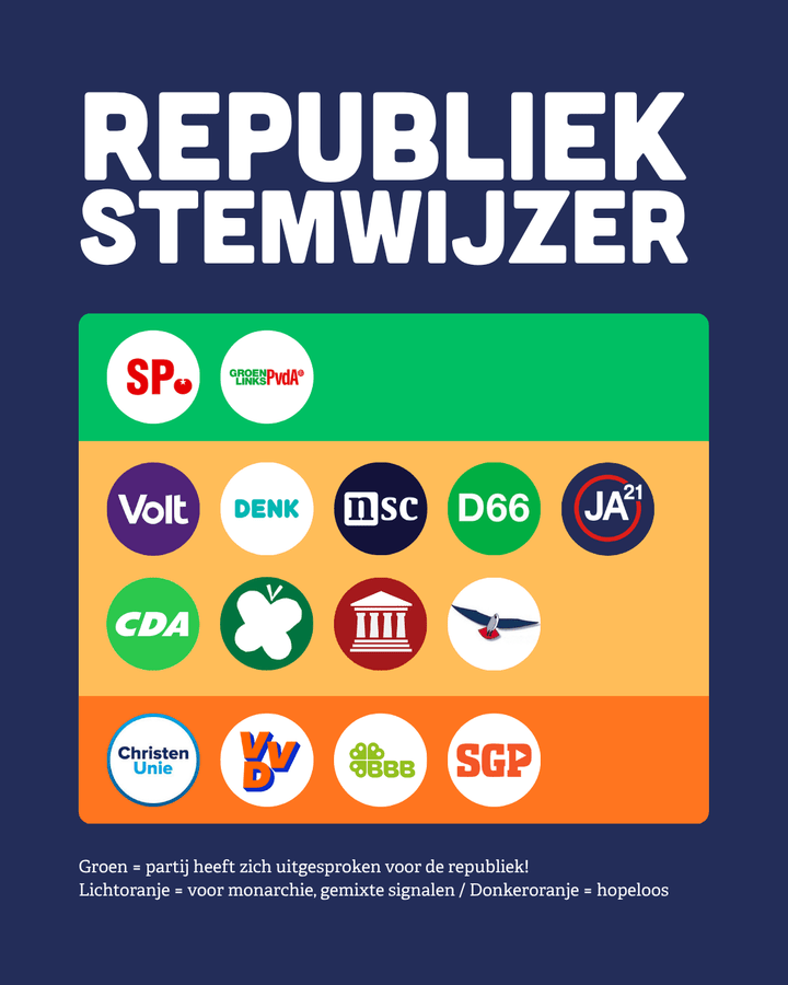 Er zijn twee partijen die zich in het verkiezingsprogramma uitspreken voor een republiek: SP, GroenLinks-PvdA.