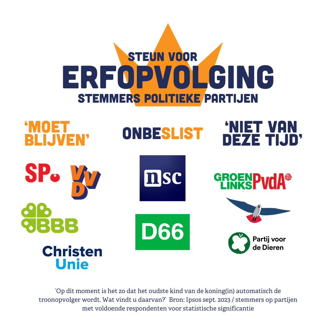 Nederland is verdeeld over erfopvolging, zo blijkt uit een nieuwe peiling van onderzoeksbureau Ipsos. 44 procent van de Nederlanders vindt dat de traditie moet blijven bestaan. Een even groot deel is het daar niet mee eens en zegt dat erfopvolging ‘niet meer van deze tijd’ is.