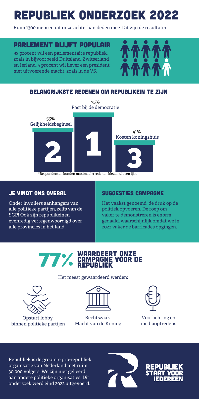Waarom ben je voor een republiek? Hoe moet die eruit zien? Wat vind je van onze campagne? We vroegen het in het Republiek onderzoek 2022. Ruim 1300 republikeinen deden mee. Dit zijn de resultaten: